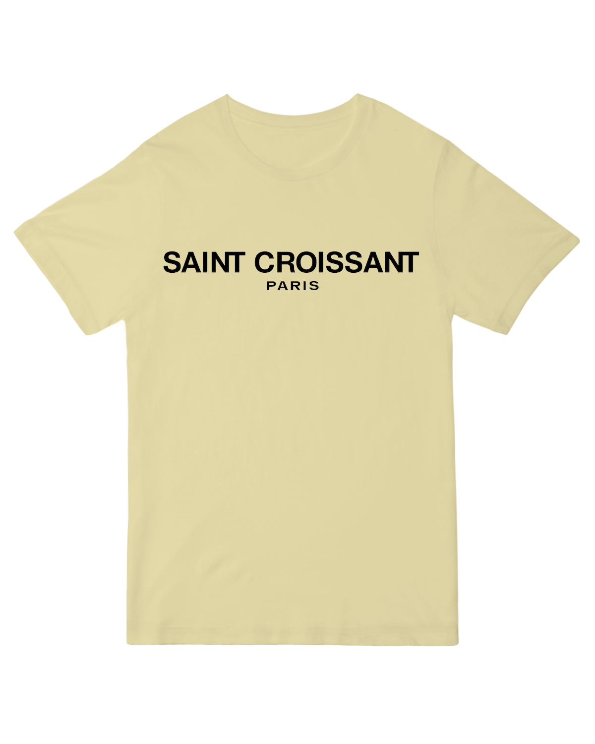 "Funny 'Saint Croissant' French bakery t-shirt in [color], pastry humor unisex cotton graphic tee"
