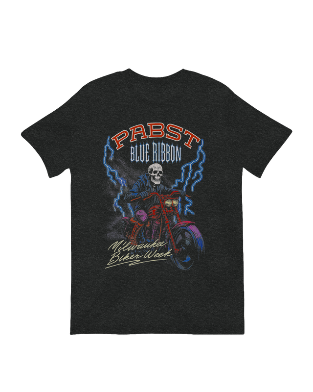 Pabst Blue Ribbon Skeleton Motorcycle - Charcoal-Black Triblend / S is backordered and will ship as soon as it is back in stock.